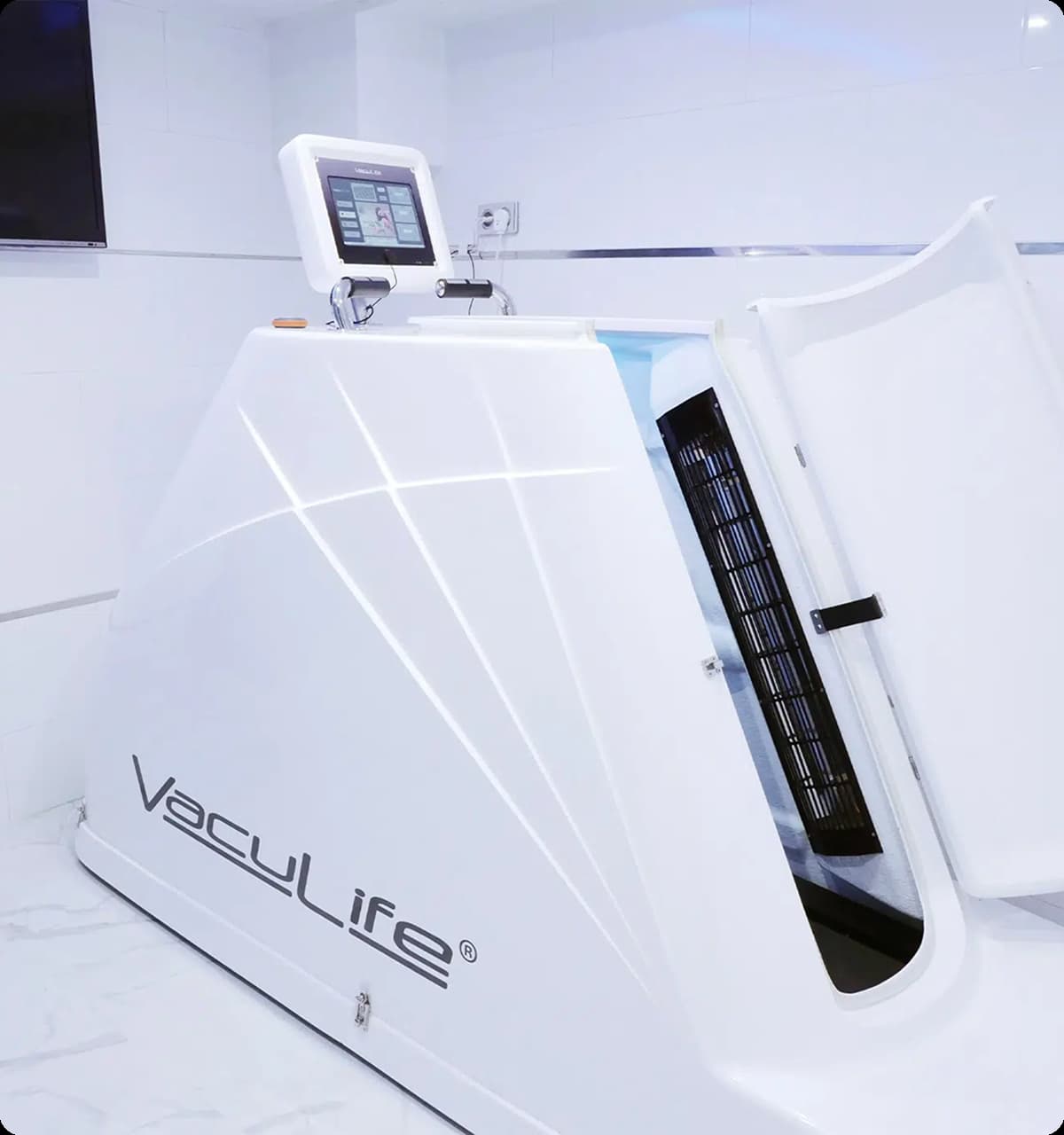 Le VacuFit est un dispositif innovant de balnéo-fitness combinant marche à basse intensité avec une pression négative (vide partiel) autour des zones ciblées, renforcée par l’effet de l’infrarouge. Le corps est maintenu dans une cuve spécialement équipée, ce qui optimise la circulation, la combustion des graisses et le drainage lymphatique.